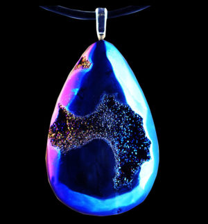 "Blue Cascade" - Teardrop Blue and Pink Druzy with Blue, Red and Gold Crystal Inlays 1.5 Inches High and 1 Inch Wide