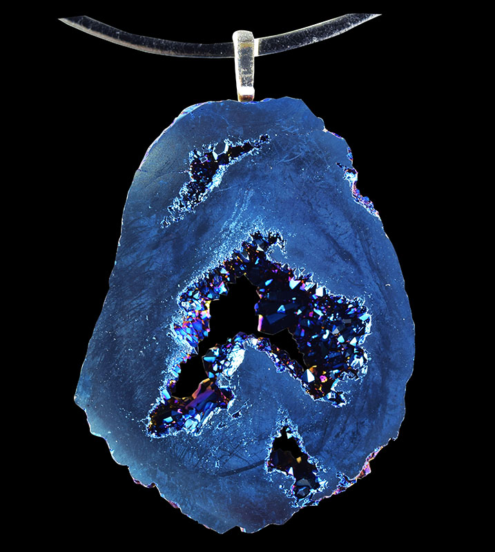 "Blue Danube" Blue Druzy with Blue and Red Sparkling Crystal Inlays on 18 Inch Black Cord with 4 Inch Sterling Silver Chain Extender