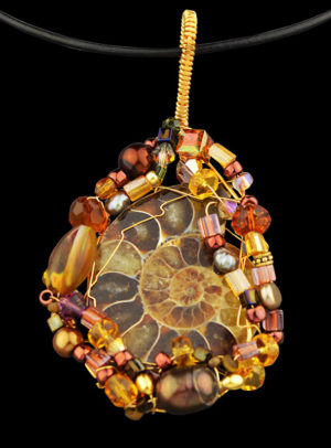 "Amonite" - Pendant with an Amonite Stone Encaged in 24K Gold Filled Wire, Gold Filled Swarovski Crystals, Natural Stones Mounted on Leather Cord with 4 Inch 24k Gold Filled Chain Extension
