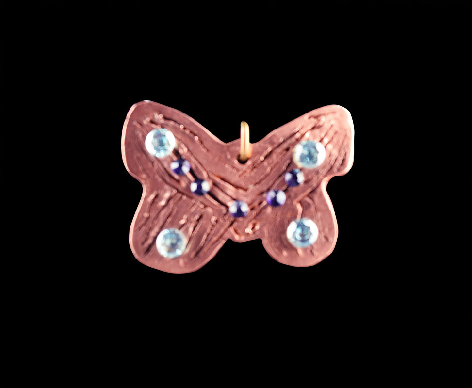 Cooper Butterfly Pendant with 4 Green Cubic Zirconium Crystals, 5 Purple Swarovski Crystals on 18 Inch Black Leather Cord and 4 Inch Copper Chain Extender