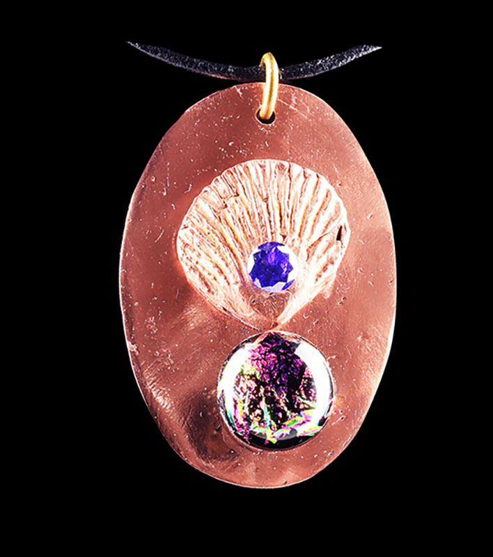 Copper Oval Pendant 1 1/8 Inches Wide and 1 3/4 Inches High with Copper Sea Shell, Dichroic Glass Bead, Purple Cubic Zirconium Crystal on 18 Inch Black Leather Cord and 4 Inch Copper Chain Extender |