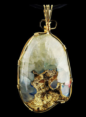 “Druzy” – Pendant with Gold Crystals Shimmering in the Depths of this Geological Piece Wrapped with 14K Gold Filled Wire on an 18 Inch Black Cord with a 4 Inch Extender 195