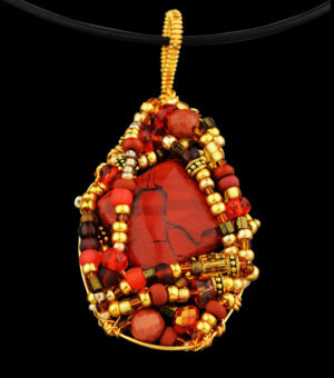 "Beadafull" - Natural Stone Necklace Encased in 14K Gold Filled Wire and Hung on an 18 Inch Leather Cord with 4 Inch Extension. Stone is Surrounded with 24K Gold Filled Beads, Swarovski Crystals and Assorted Beads