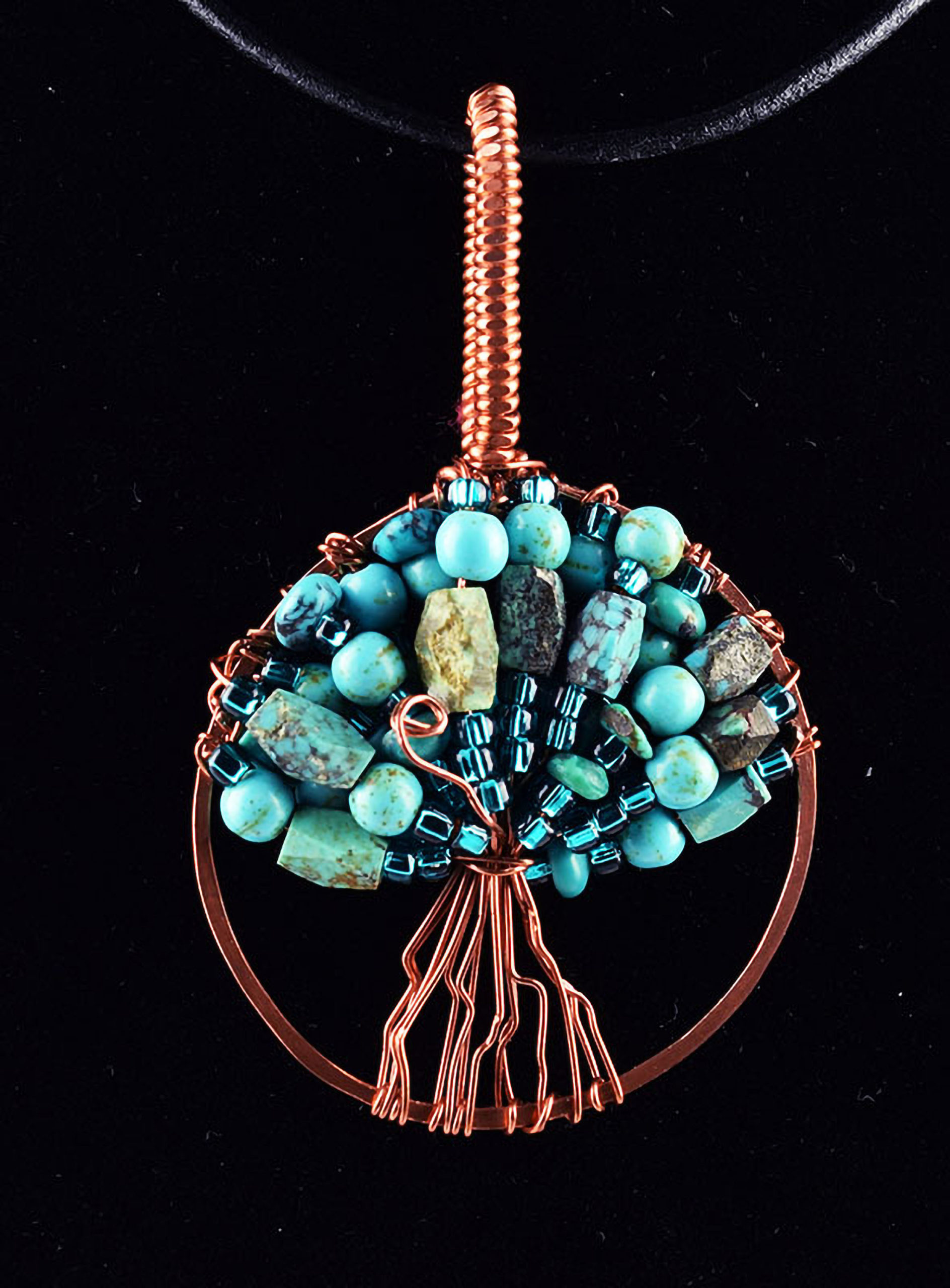 "Tree of Life" - Necklace with Copper Wire Surrounding Toho Beads, Turquoise Nuggets and Round Polished Turquoise Beads on 18 Inch Black Leather Cord with 4 Inch Copper ChainĀ  Extender
