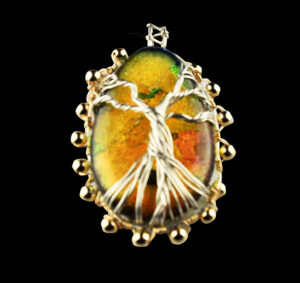 “Tree of Life” Necklace with Sterling Silver Tree Mounted on a 1 3/4 by 1 Inch Oval Cabochon Surrounded by 14K Gold Filled Beads on  18 Inch Black Leather with a 4 Inch Chain Extender 507